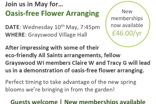 After impressing with some of their eco-friendly All Saints arrangements, fellow Grayswood WI members Claire W and Tracy G will lead us in a demonstration of oasis-free flower arranging.
